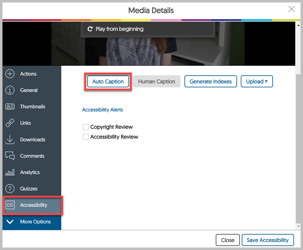A new window appears. Choose “Accessibility from the panel on the left side and then select “Auto Caption”.