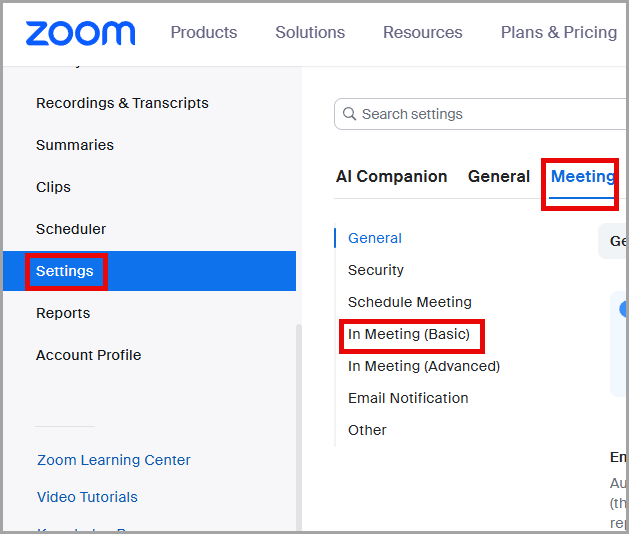 Check your Settings to make sure you’ve enabled polls. Go to Settings, choose "Meeting" from the options across the top, and "In Meeting (Basic)" from the menu that appears.