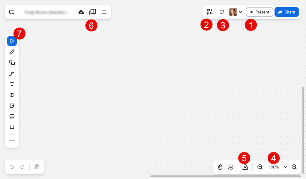 Comment - Add a tiny speech bubble anywhere on the canvas. This saves space if you need to leave a long comment. Hovering over the speech bubble brings up the text. Clicking on it allows participants to reply so an entire conversation can be held in a very small space