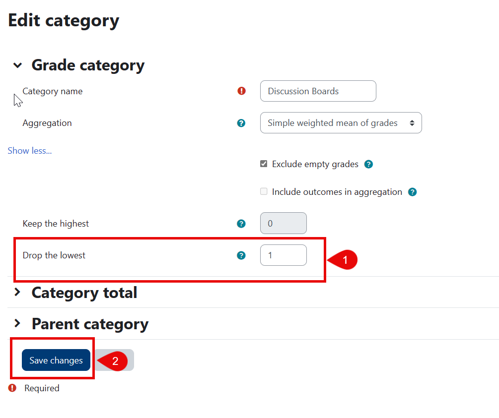 - In your settings for that grade category, you "Grade category," "Category total," and "Parent category." In the "Grade category" section, click on the words "show more." Now, you are able to see two different grade item features: "keep the highest" and "drop the lowest." You can decide if you want to the gradebook to only record a certain number of grades, or if you want to the gradebook to drop a certain number of grades by the end of the semester.