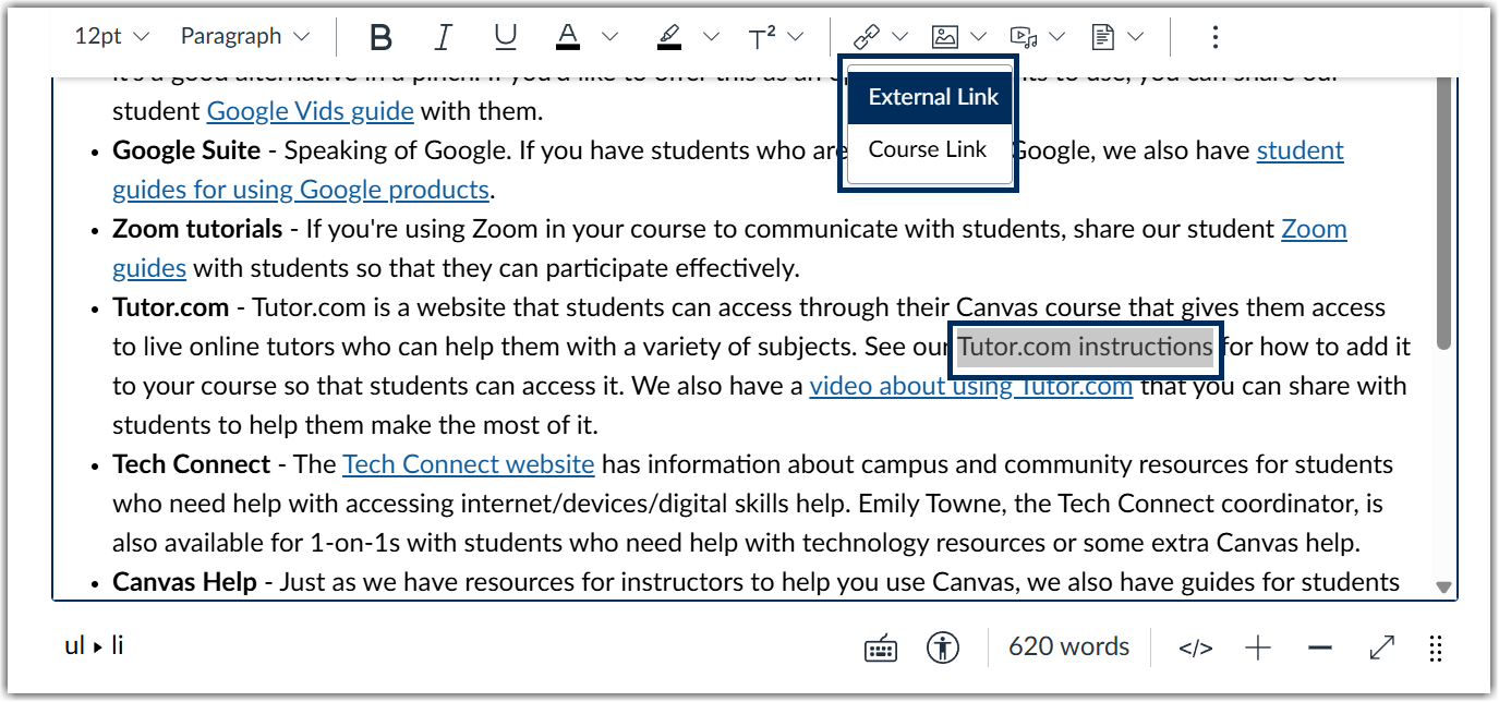When you are hyperlinking text in your Canvas course, you will be given the option to use a Course Link or an External Link.