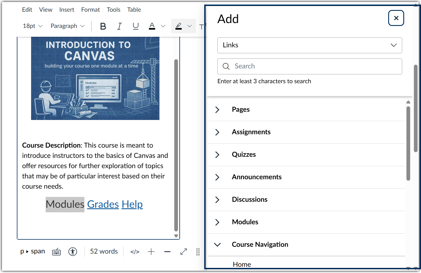 - Course Link - This is an internal link that links your words to another page in your Canvas course. For example, you might want to have a link to the Grades page on the Front page of your course so that students can have an easy way to check their grades each time they enter the course.