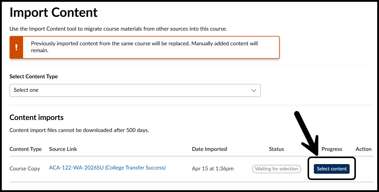 - On the right side of the screen where you see a list of options, choose the option for "Import Existing Content".