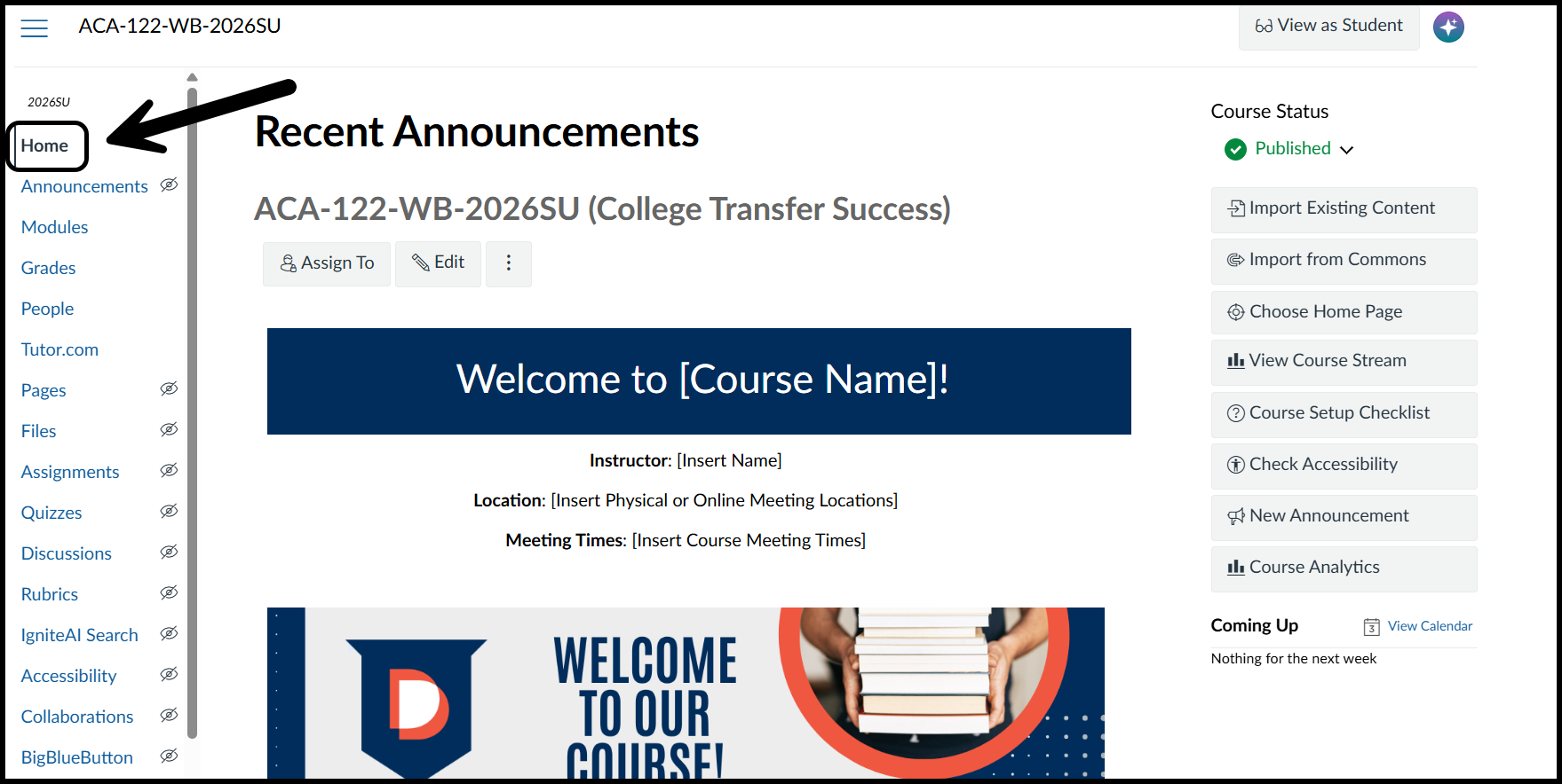 After content is imported, your "Home" page should still contain the template for you to edit, as shown below.