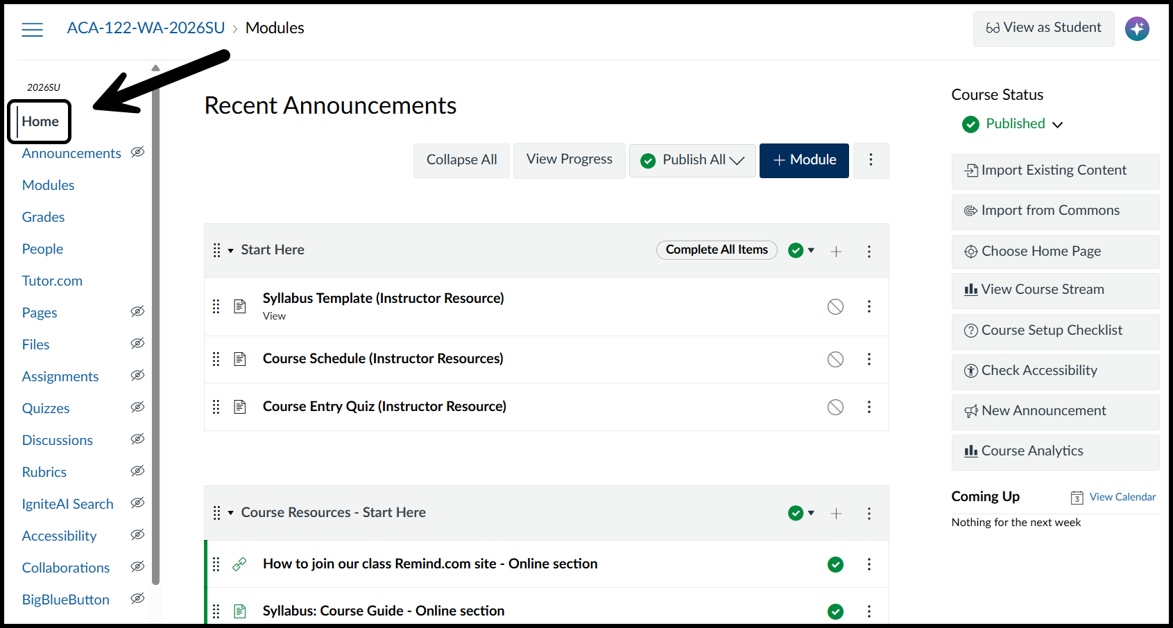 If your Home page shows the modules, as shown below, you'll need to change the home page.