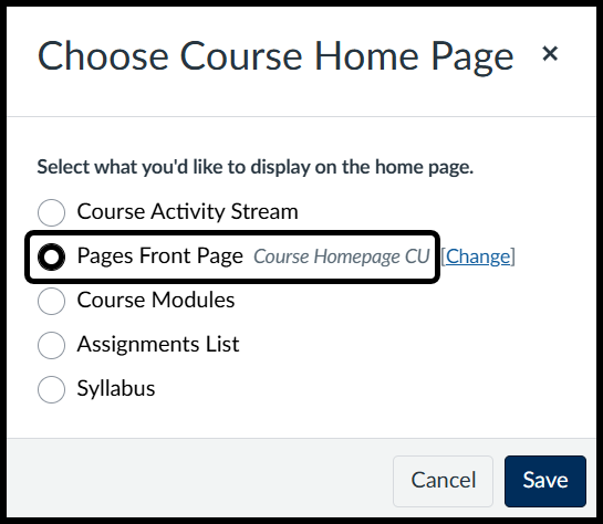 - In the popup box, choose "Pages Front Page" from the list of options and "Save"