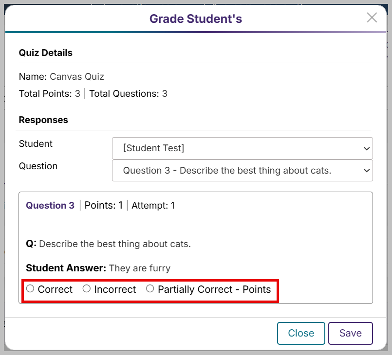 A box will open with the name of the quiz, a drop-down box for moving between students, a drop-down box for moving between questions, the question, the student’s answer, and a place to check correct or incorrect or award partial points.